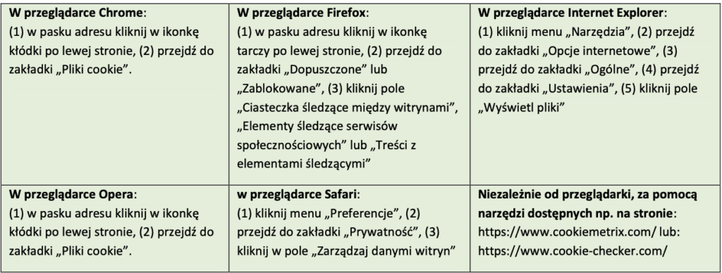 7.4. Sprawdzenie w najpopularniejszych przeglądarkach internetowych, jakie pliki Cookies (w tym okres funkcjonowania plików Cookies oraz ich dostawca) są wysyłane w danej chwili przez stronę Sklepu Internetowego jest możliwe w następujący sposób: